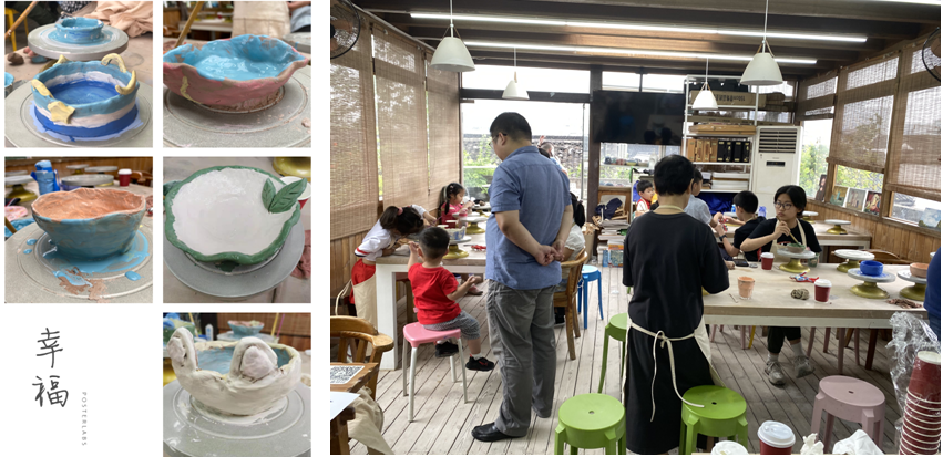 本次活動特別邀請專業的陶藝老師進行指導,讓孩子們了解中國傳統古老的陶藝文化。老師教大家的是手捏(雕塑)成型法,這是陶藝最原始、最基本簡單的方法,適合初學者。老師展示了如何打底、疊加陶泥進行連接和塑形。如何運用塑刀等工具修改作品。最后進行上釉完成作品。經老師指導,孩子們盡情地發揮自己的創造能力。呈現出造型各異的作品。